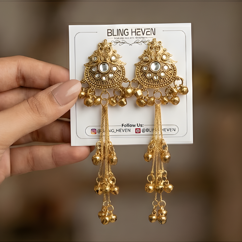 Celebrate the elegance of traditional craftsmanship with these stunning Kashmiri Gold-Plated Long Jhumka Earrings by Bling Heven. Designed with a richly detailed circular top featuring classic Kashmiri-inspired motifs and mirror-like stone accents, these earrings flow into graceful cascading chains adorned with delicate ghungroo bells.